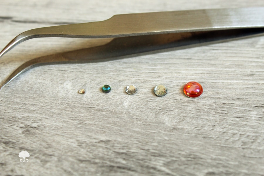 Strasssteine kommen in unterschiedlichen Größen daher. Ihre Größe wird meist in Milimeter oder in „SS#“ (# steht für eine Zahl) angegeben.
