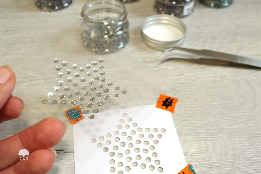Du kannst die Steine entweder einzeln in die jeweiligen Löcher setzen oder du fegst sie mit einem Pinsel ein. Achte darauf, dass die Klebeflächen immer nach unten zeigen und passe nicht richtig sitzende Steine an.