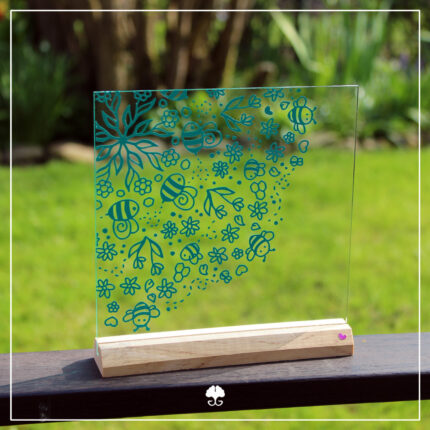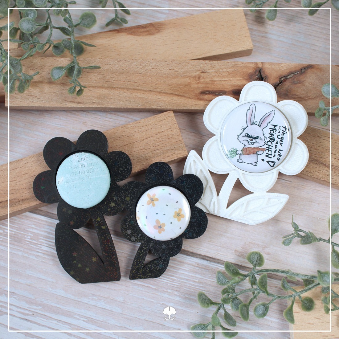 Die Blumen der Klötzchenschrift haben eine Vertiefung für Buttons. Und noch eine weitere für einen Flachmagnet bis zu 8mm. Klebe den Magnet ein und tausche den Button flexibel aus. Natürlich kannst du ihn aber auch direkt einkleben.