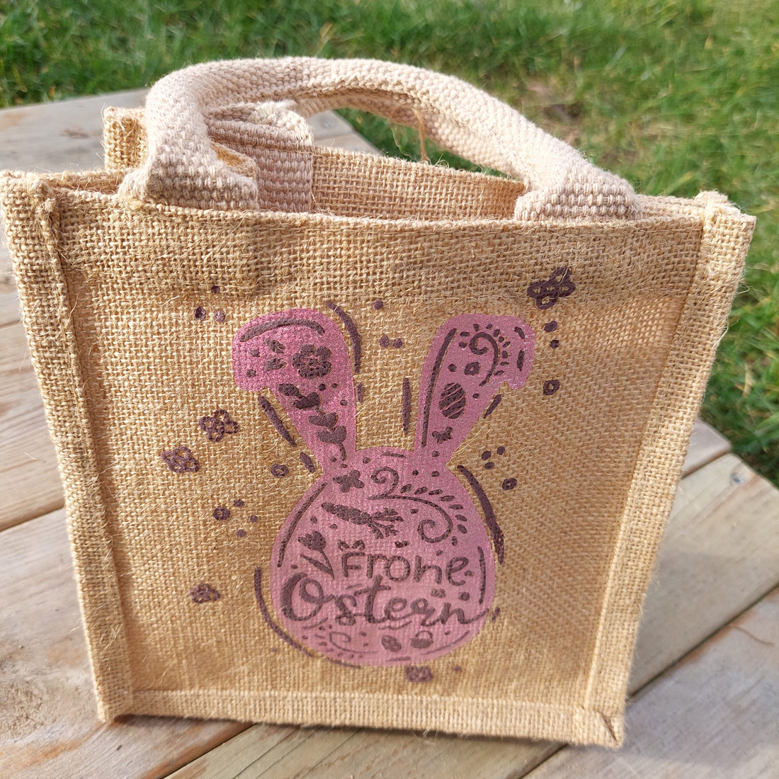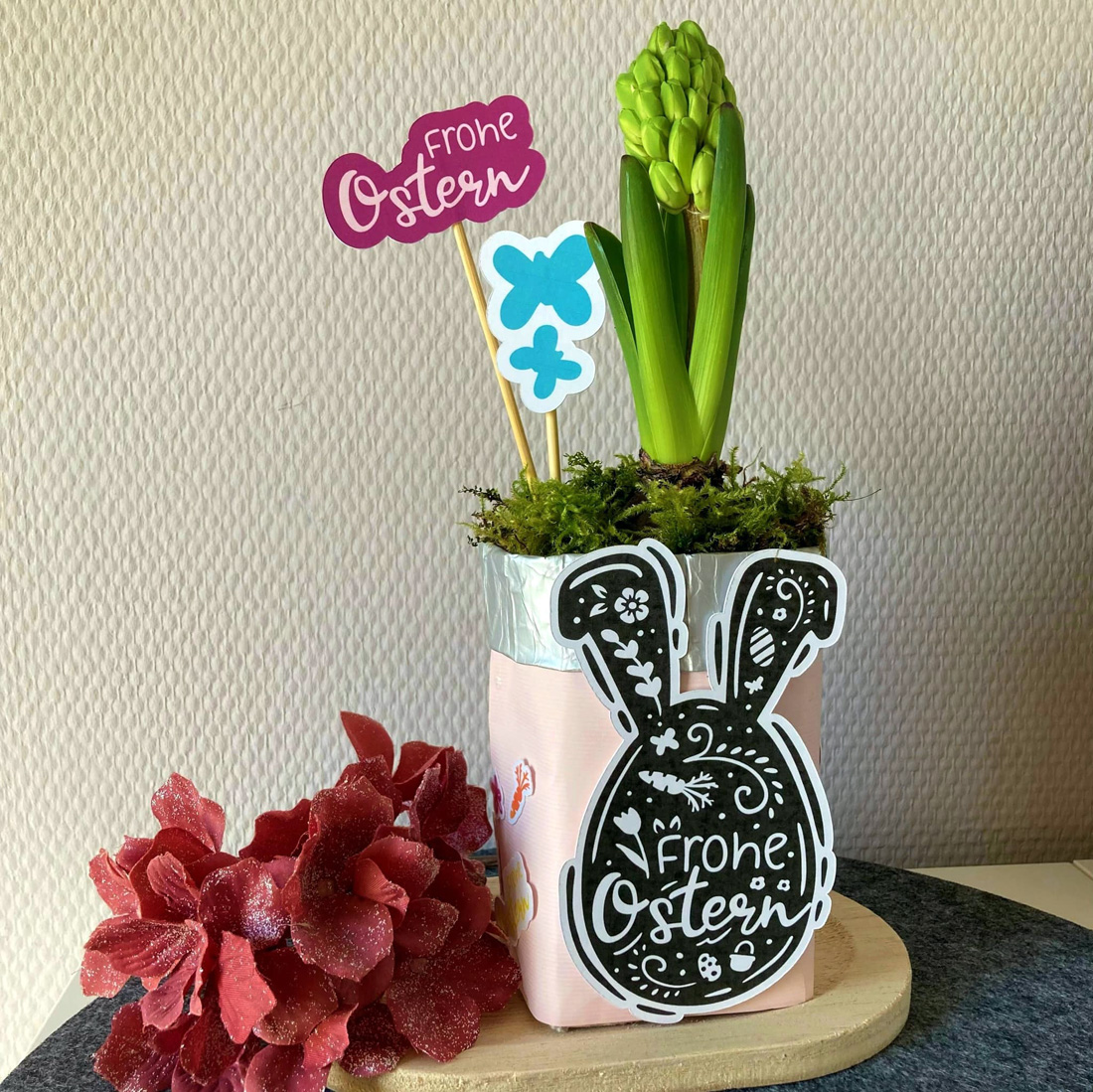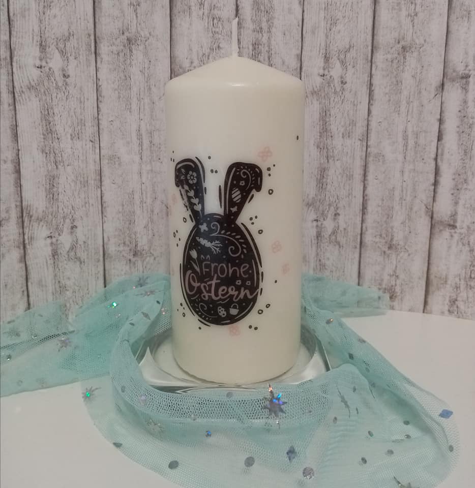 Dann nutze Alternativen wie die Lasergravur oder Sublimation. Aber auch Kerzen- bzw. Tattoofolien eignen sich, um Hase und Ei umzusetzen.