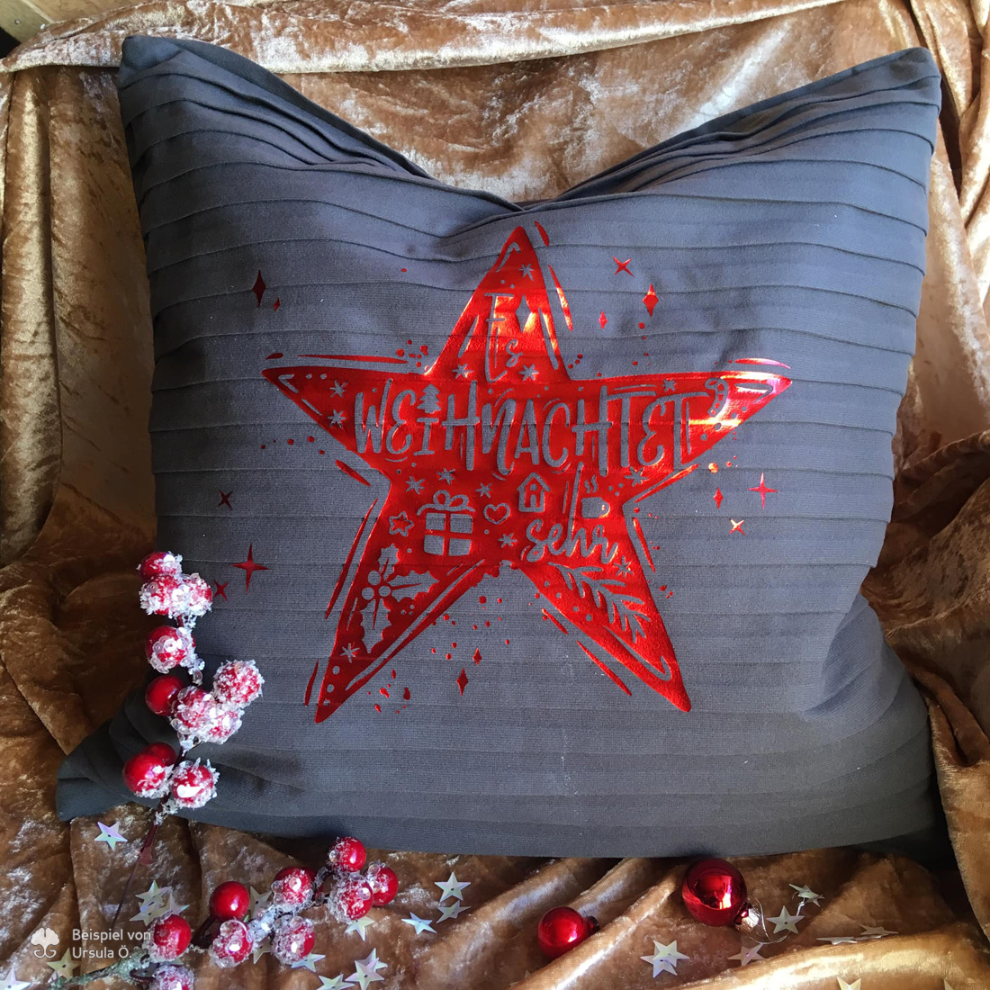 Wenn es zu Weihnachten überall funkelt und Lichter für eine besondere Stimmung sorgen, darf eins nicht fehlen: Sterne! Sie sind der Allrounder bei der Weihnachtsdeko. Nutze die Doodle Silhouetten „Stern“ – Plotterdatei um tolle Akzente und Hingucker zu gestalten. Das Motiv ist nicht nur für Kissen geeignet, sondern kann von dir auch genutzt werden, um Dekoteller zu gestalten. Mit metallischen Folien funkelt dieser Stern dann ganz besonders.