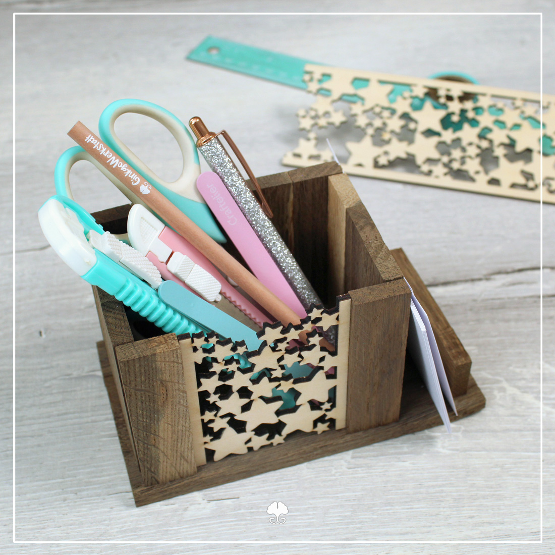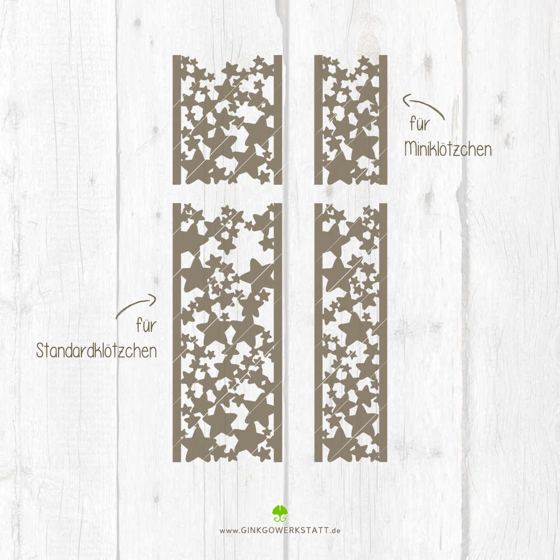 Gerade in der Weihnachtszeit bastelst du gerne mit Klötzchen und liebst den rustikalen Charme? Wie wäre es, wenn du sie mit der Klötzchendeko „Sterne“ kombinierst? Hast du einen Laser oder Plotter, kannst du bei deinen Bastelprojekten zwei oder auch drei Klötzchen jeweils mit den Dekosternen ersetzen. So werden Serviettenhalter, Memobretter und andere Flächen ganz besondere Unikate.