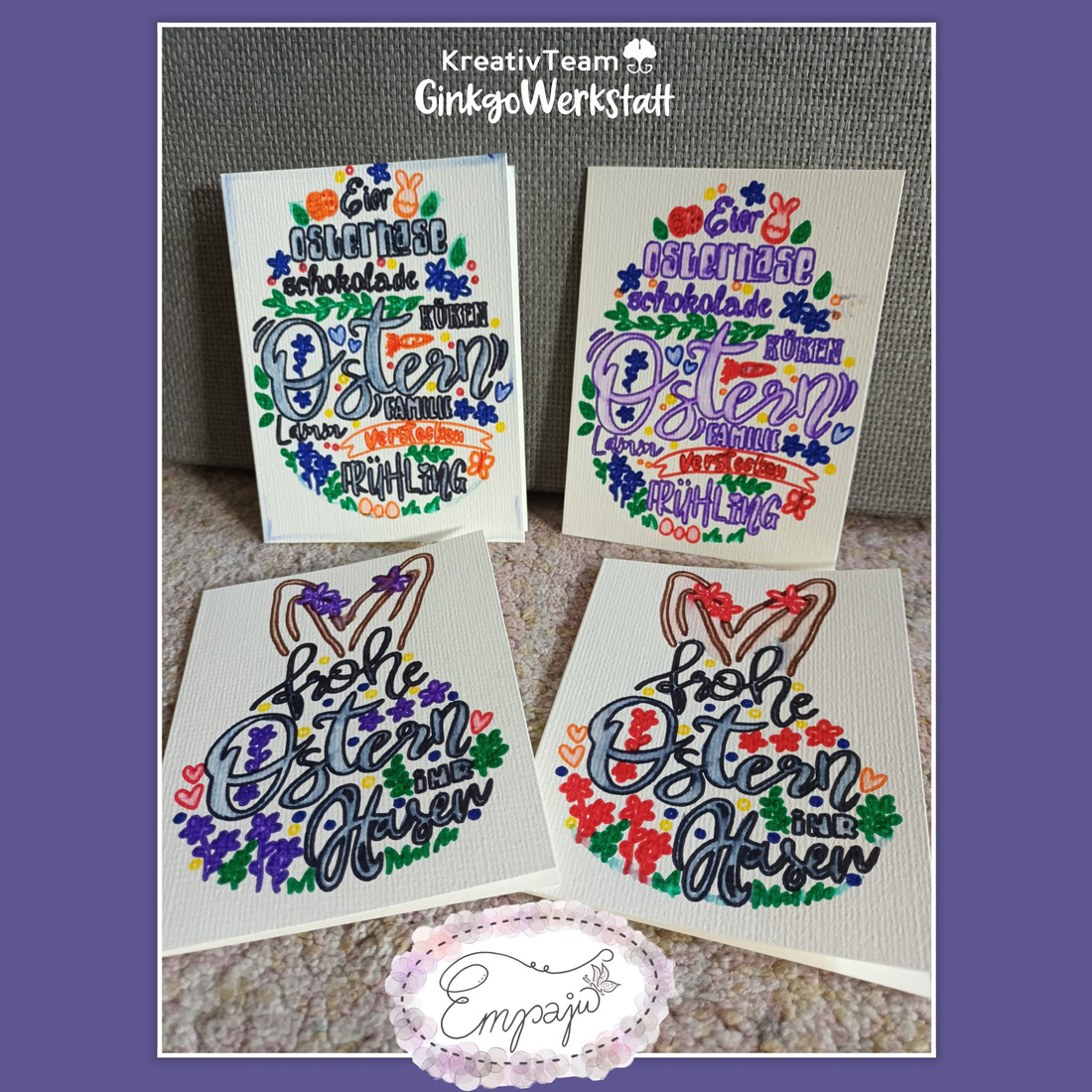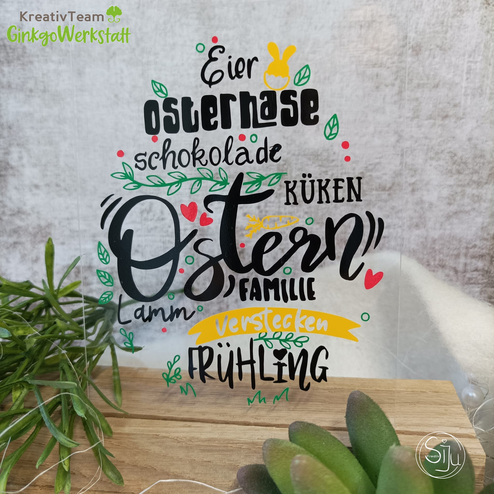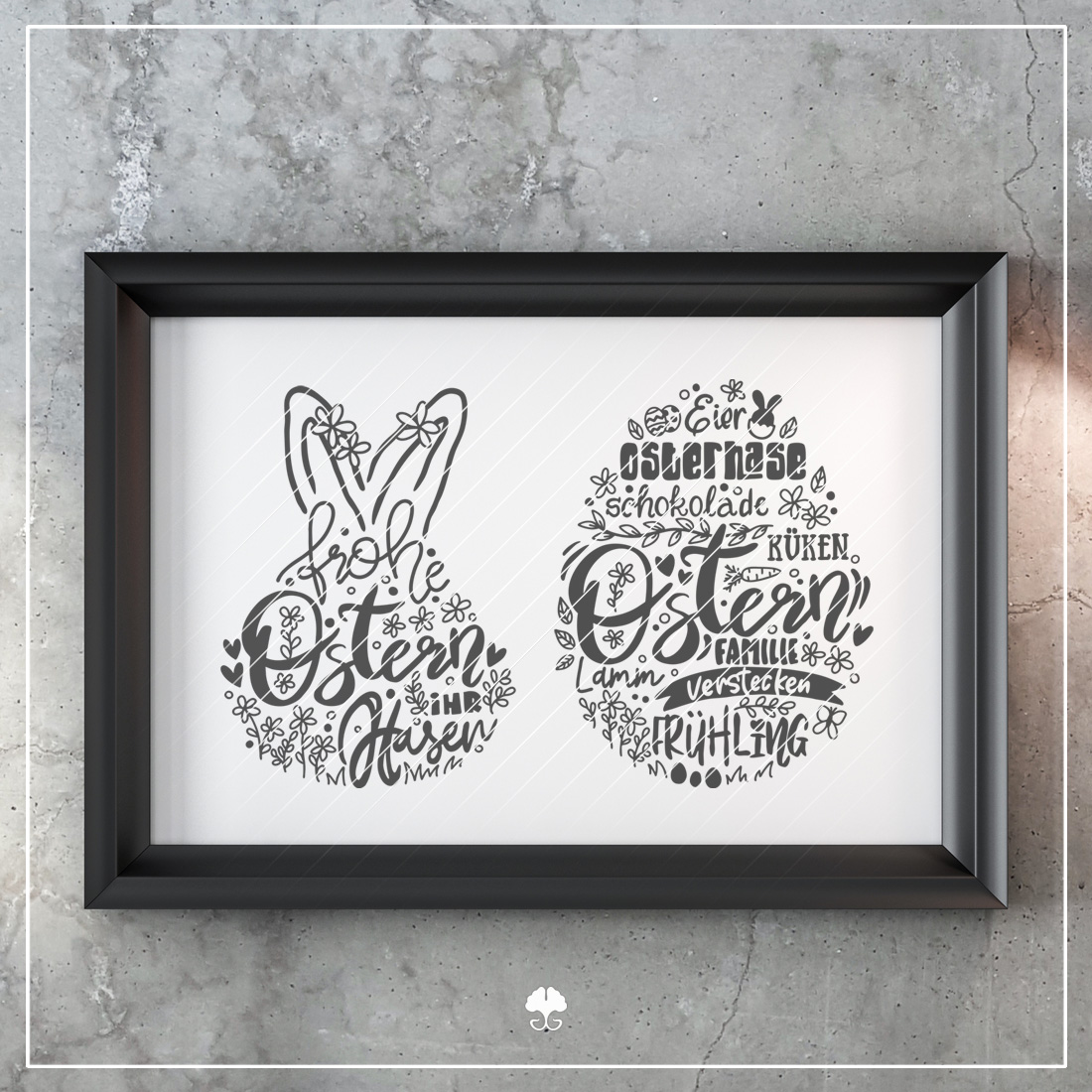 Mit der Lettering „Ostern“ – Plotterdatei bekommst du zwei verschiedenen Designs: einmal ein Osterei und einmal einen Osterhasen. Beide Designs sind so aufbereitet, dass du sie sowohl ein- als auch mehrfarbig umsetzen kannst.