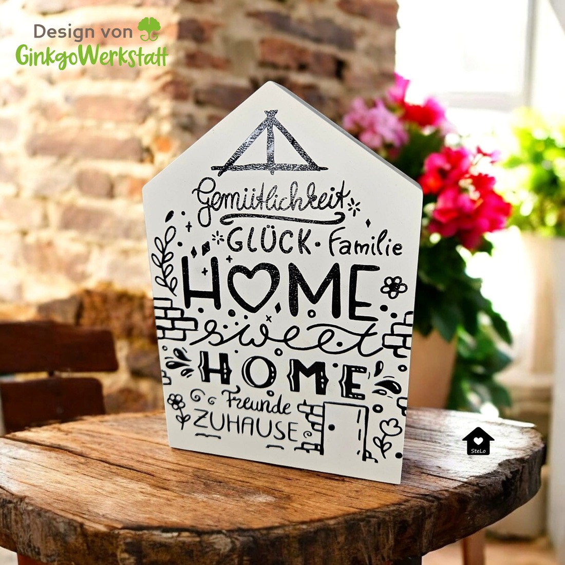 Ist wohl einer der bekanntesten Sprüche, wenn es um die heimische Dekoration geht. Das Design zeigt nicht nur diesen klassisches Spruch, sondern auch das, was ein echtes Zuhause ausmacht: Familie, Gemütlichkeit, Glück und Freunde.