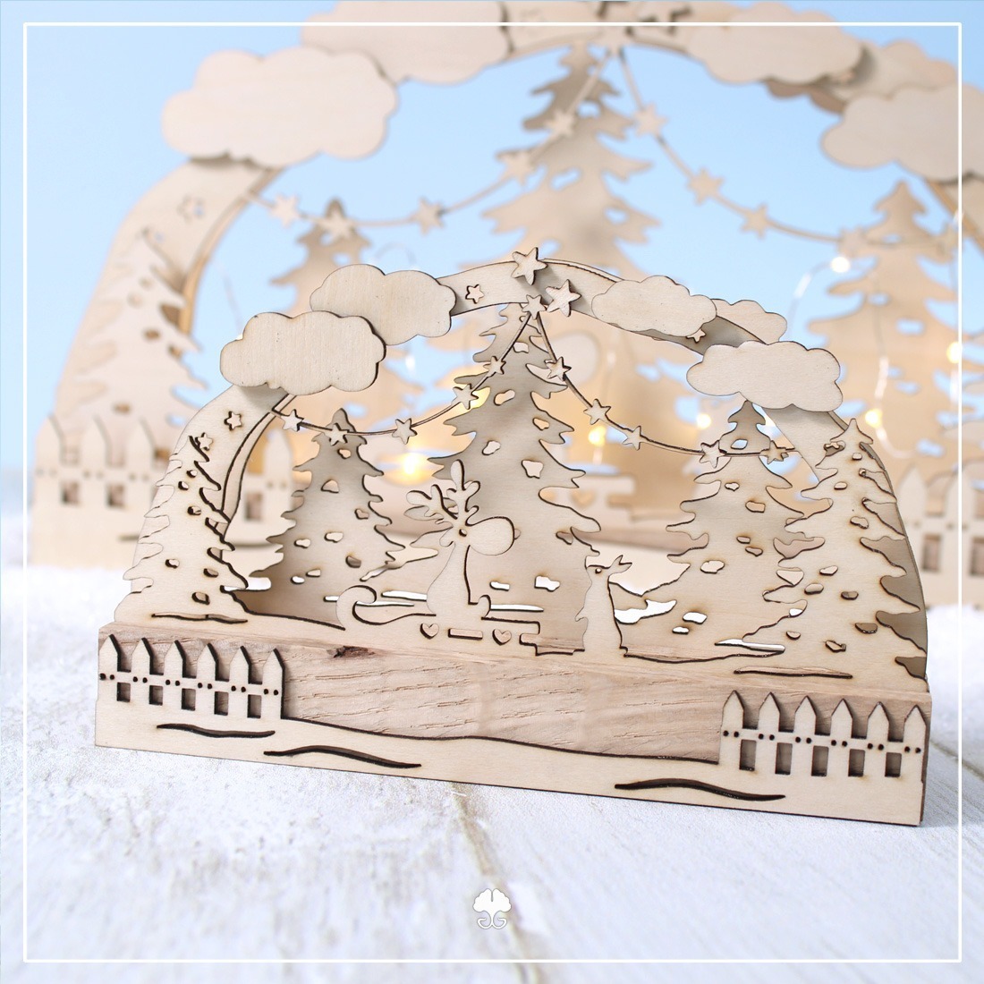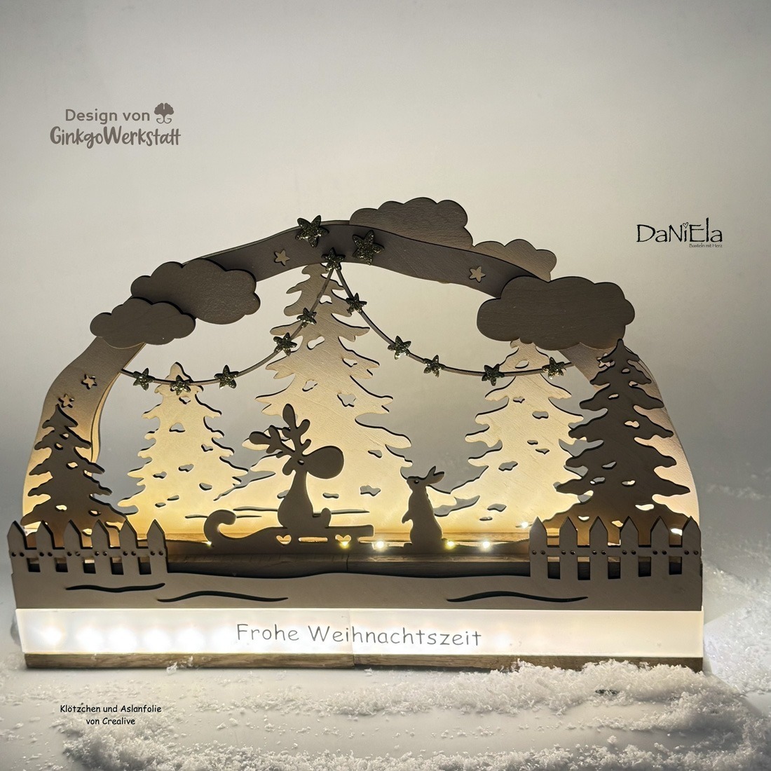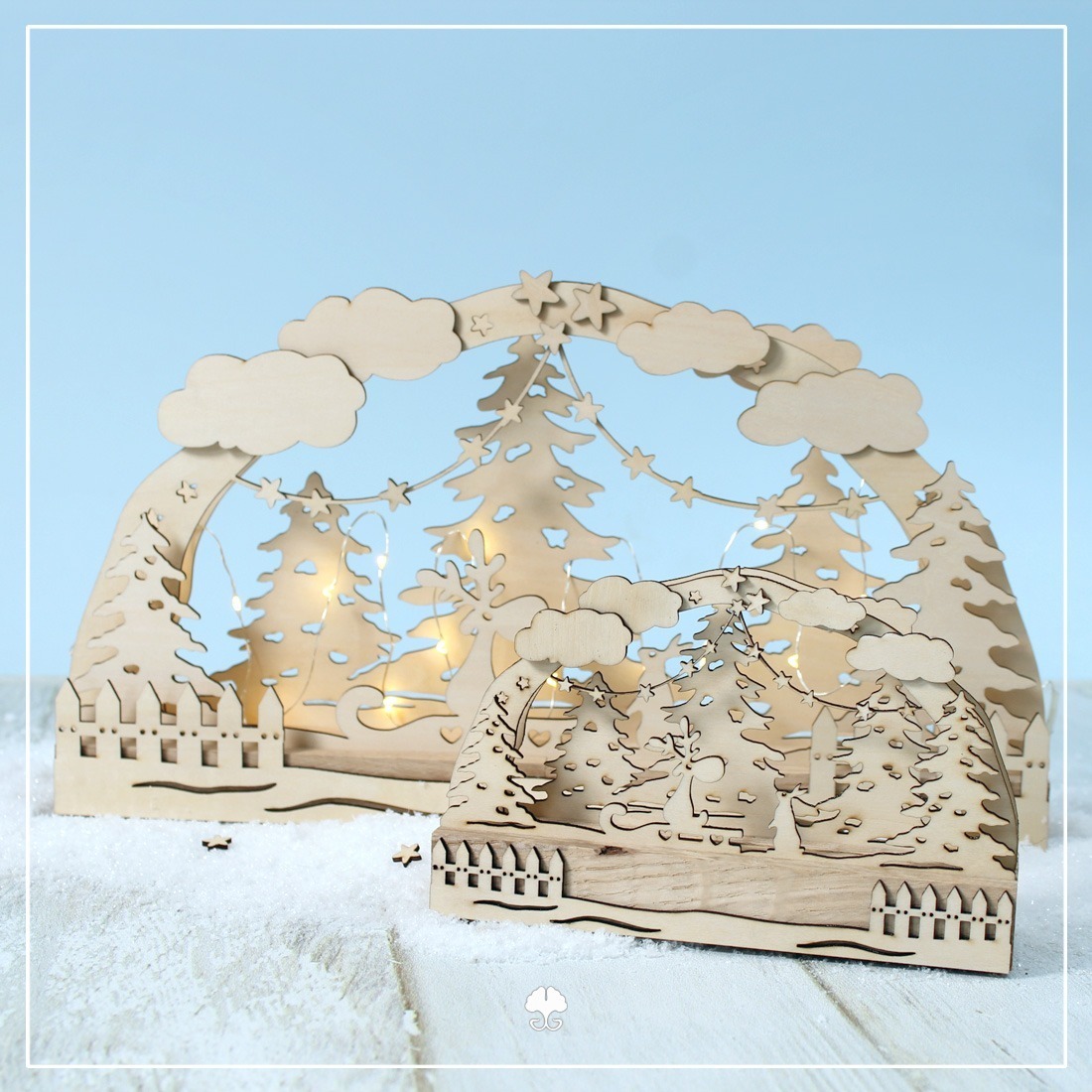 Hast du einen Laser kannst du den Lichterbogen in Originalgröße oder auch verkleinert nutzen. Er ist für eine Breite von 320mm gedacht. Das entspricht zwei Klötzchen. Es passt aber auch, wenn du ihn auf eine Klötzchengröße verkleinerst. Hier musst du das Füßchen aber selbst anpassen, falls nötig.