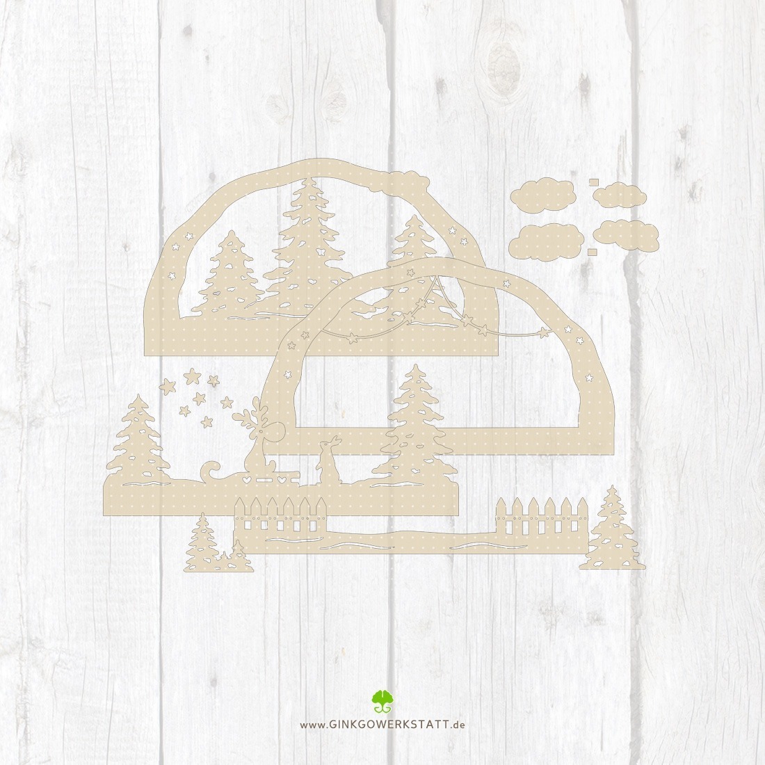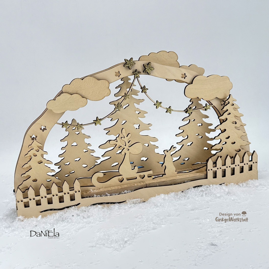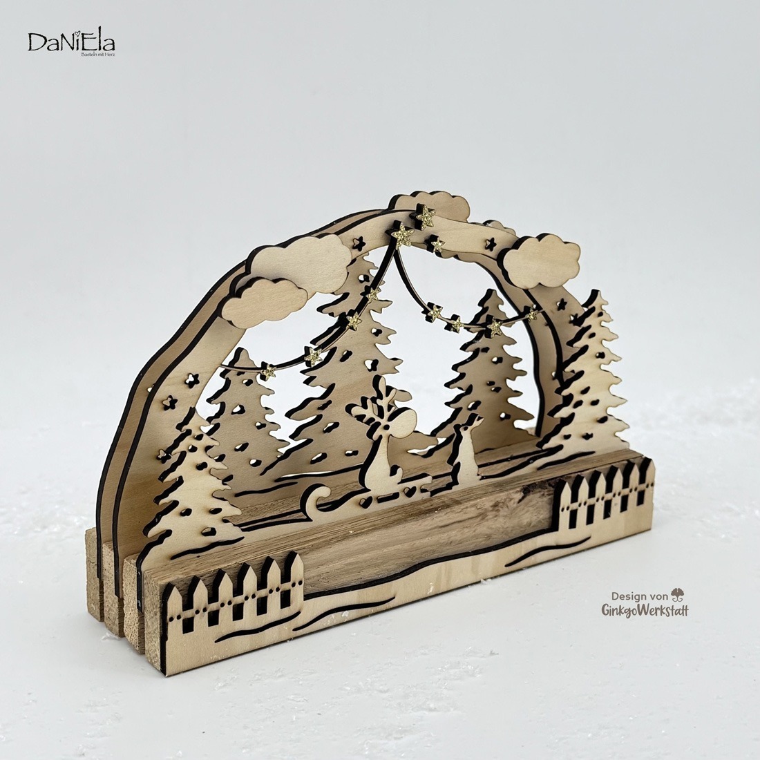 Hast du einen Laser kannst du den Lichterbogen in Originalgröße oder auch verkleinert nutzen. Er ist für eine Breite von 320mm gedacht. Das entspricht zwei Klötzchen. Es passt aber auch, wenn du ihn auf eine Klötzchengröße verkleinerst. Hier musst du das Füßchen aber selbst anpassen, falls nötig.