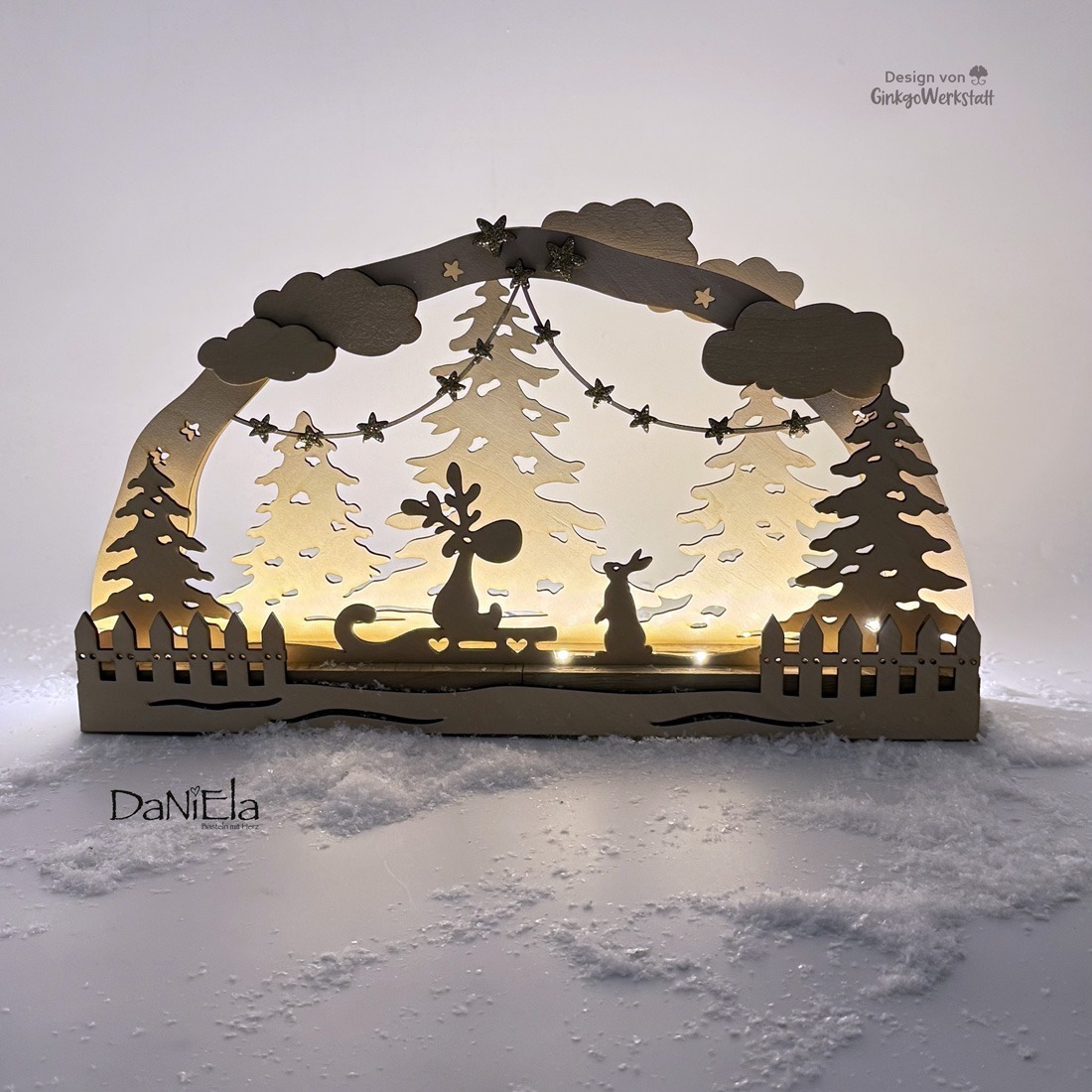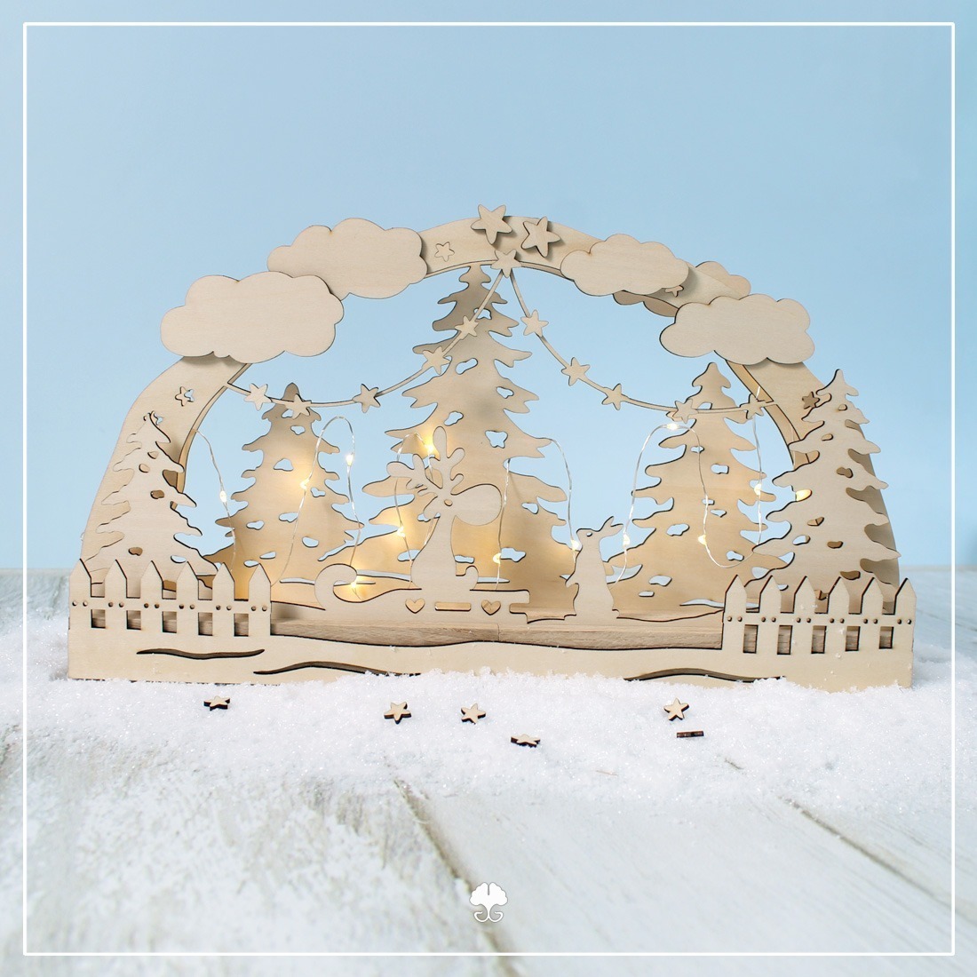 Winterzeit ist Lichterzeit. Während die meisten Lichterbögen sich vorrangig an der Weihnachtszeit orientieren, ist der Lichterbogen „Sternenzauber“ so gestaltet, dass er auch im Winter genutzt werden kann. Laß dich zusammen mit Elch und Hase verzaubern, wenn sie deine Räume erleuchten.