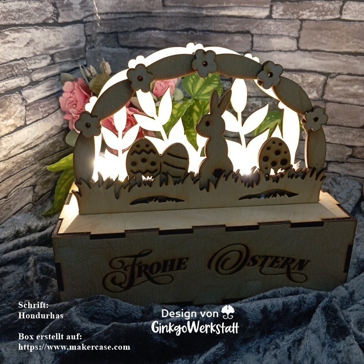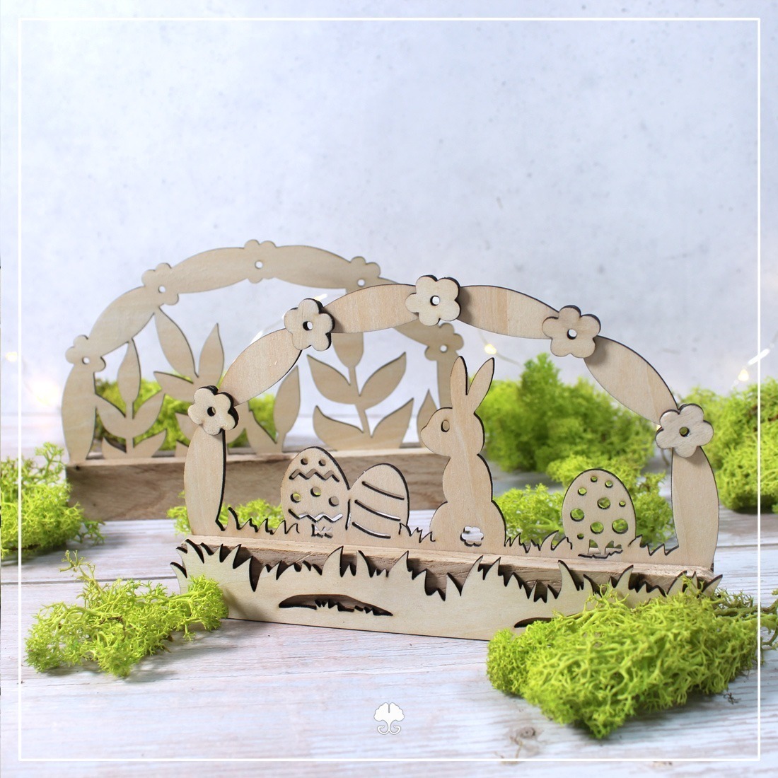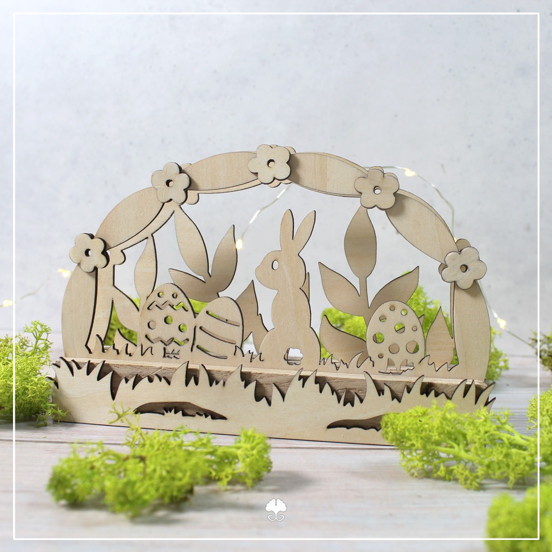 Mit der niedlichen Mini-Lichterbogen „Hase im Gras“ – Kreativdatei kannst du zu Ostern tolle Tischdekorationen mit oder ohne Licht zaubern. Du kannst die Elemente auch verwenden, um einen Serviettenständer oder andere österliche Dekoratinen zu basteln. Ein Hingucker ist der kleine Hase auf jeden Fall. Zwei Ostereier hat er auch schon versteckt. Wo der Rest ist, wird nicht verraten.