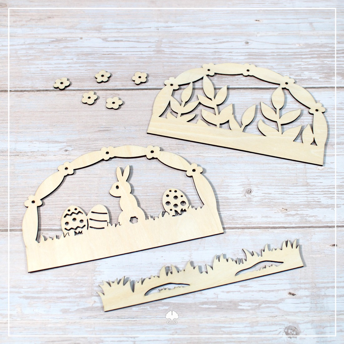 Der Hase im Gras funktioniert ideal in Kombination mit Klötzchen der Standardgröße. Schneide die drei Teile aus Holz, Acryl, Papier, Filz oder anderen Materialien und klebe sie einfach zusammen. Dann bist du schon fertig!