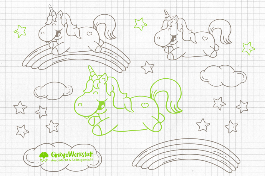 Neben zwei verschiedenen Größen vom Pummelhorn, erhälst du auch eine kombinierte Variante und ein paar Extras wie Regenbogen, Sterne und Wolken.