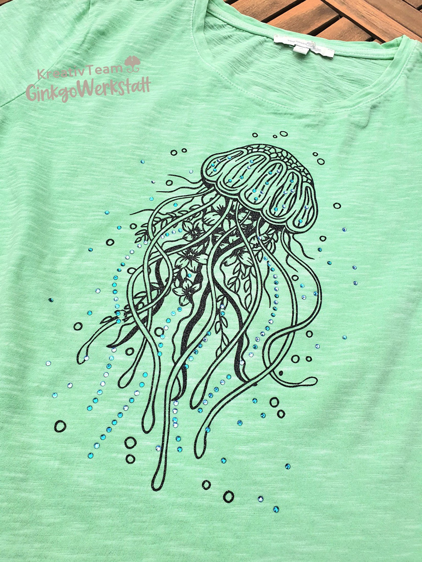 Die Strass „Qualle“ – Plotterdatei kombiniert ein filigranes maritimes Design mit floralen Elementen und hat zudem glänzende Akzente durch Strass. Außer den Strassvarianten befindet sich auch eine Version ganze ohne BlingBling im Download.