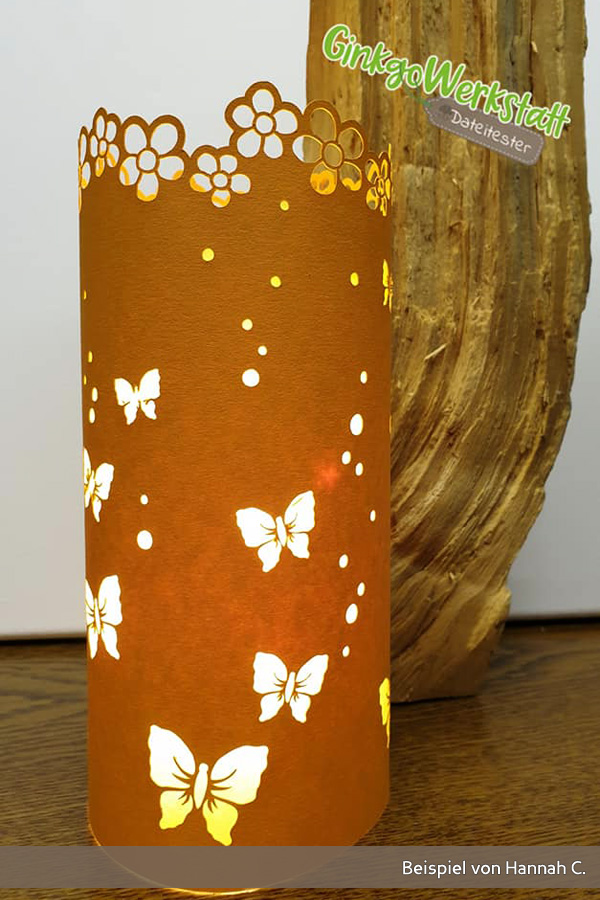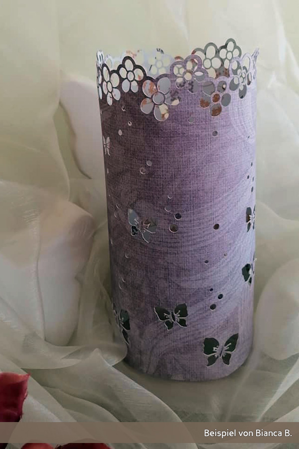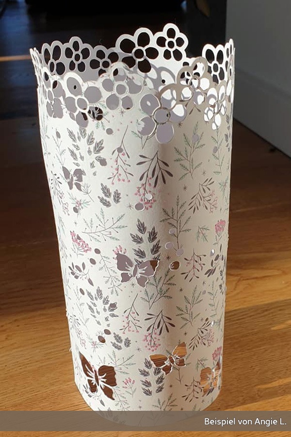 Bevor du loslegst, solltest du unbedingt einen Test wegen der Schnitteinstellungen machen. Jedes Papier verhält sich etwas anders. Meine Probeläufe haben gezeigt, dass sich dünneres Papier zwar sehr gut schneidet, aber wenig formstabil ist. Dickeres Papier wird teils nicht 100% durchgeschnitten, gibt dem Windlicht aber mehr Halt. Ist es allerdings zu steif, lässt es sich schlecht zusammenkleben.