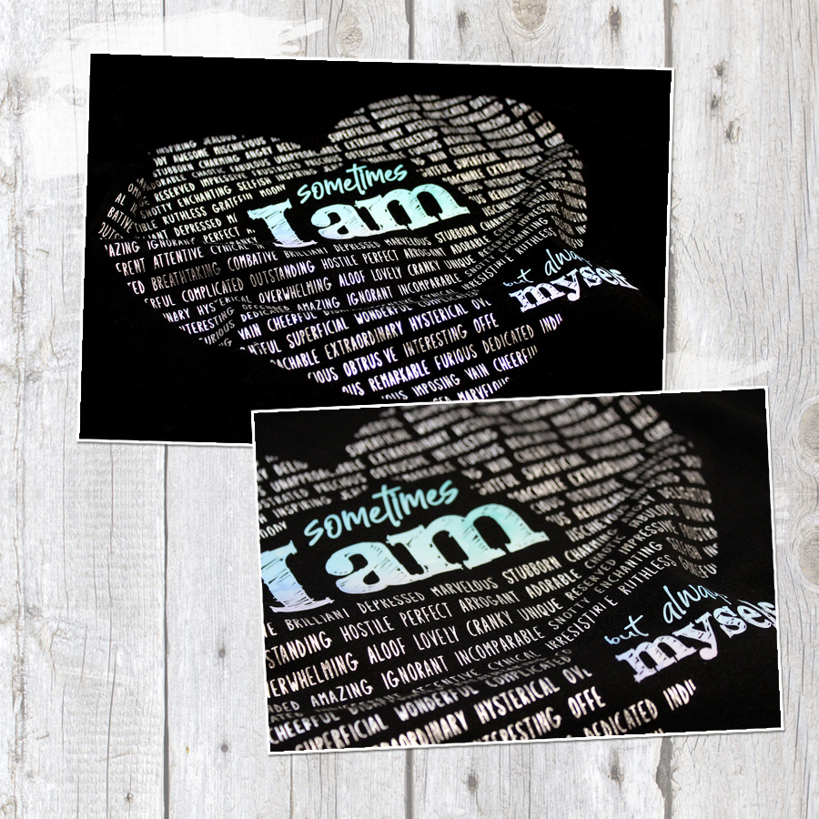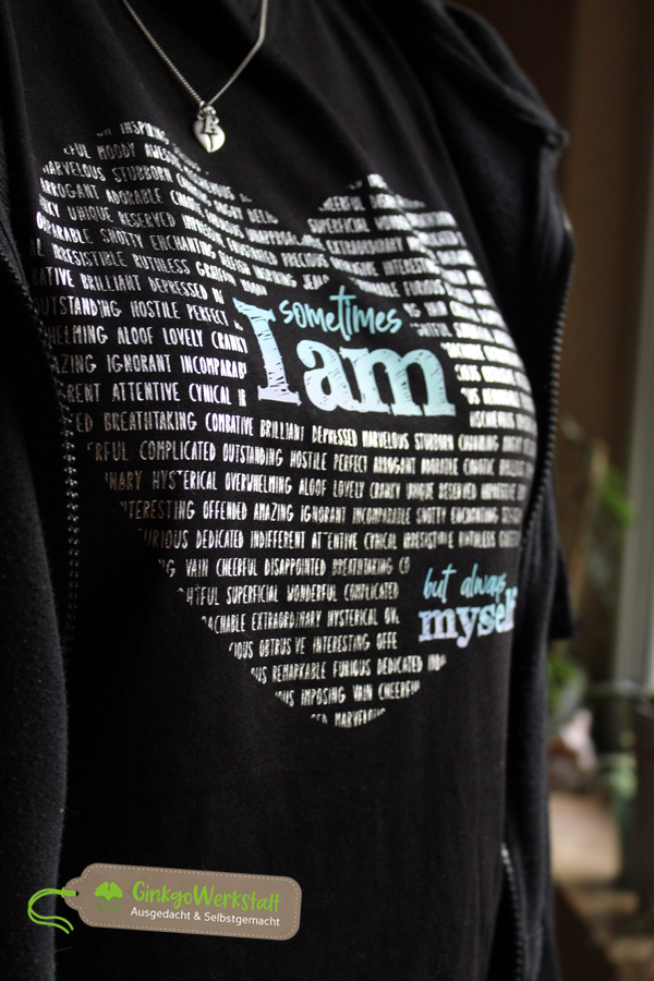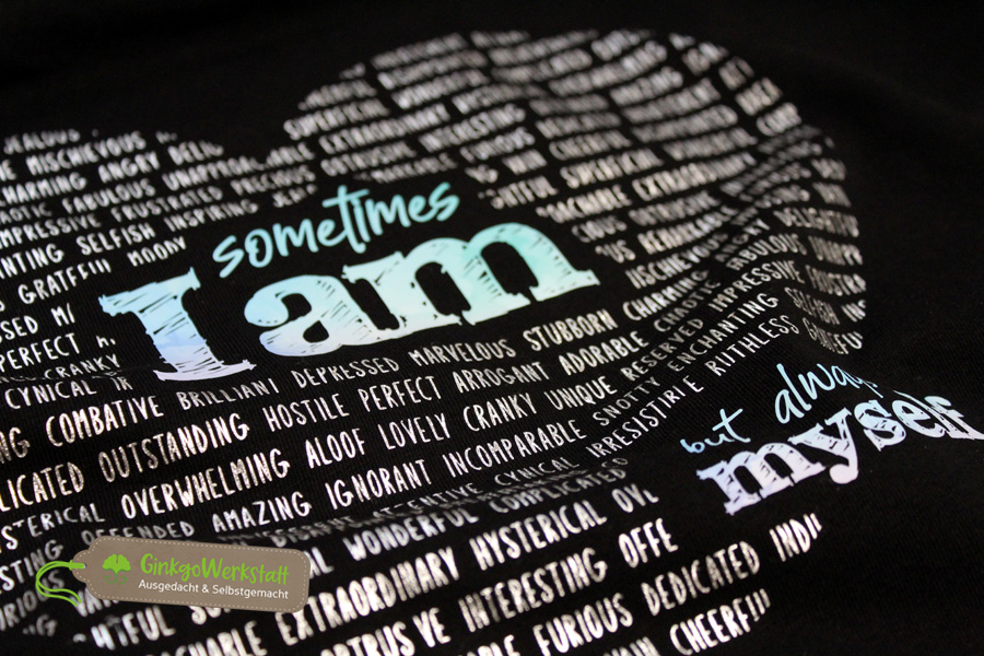 Mit der Wortspiel „I am“ – Plotterdatei stellst du klar: egal ob du einen guten oder schlechten Tag hast, du bist immer du selbst! Jeder hat Tage an denen man sich mal nicht 100% optimal verhält, aber das ist menschlich und es gehört zu einem genauso wie die positiven Eigenschaften.