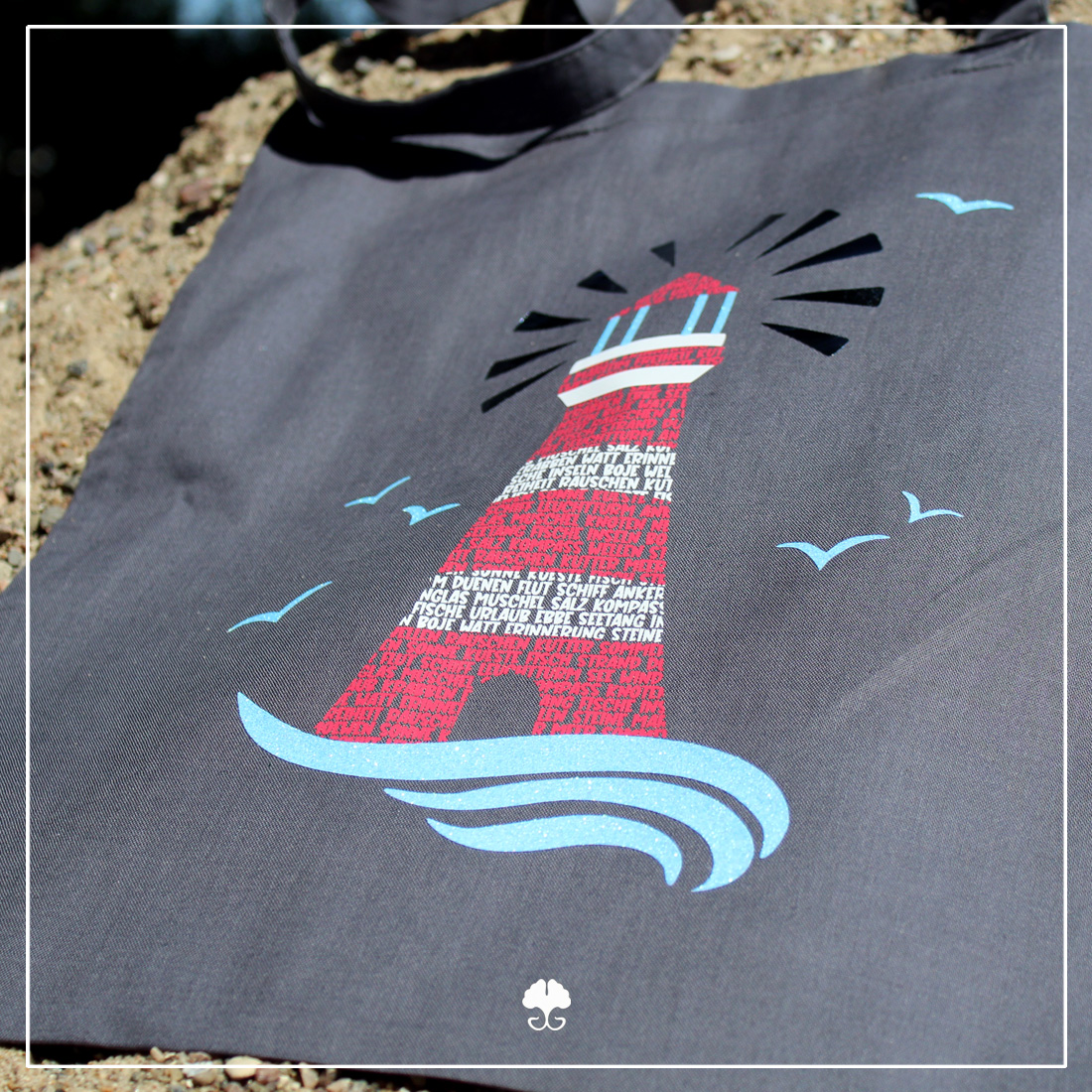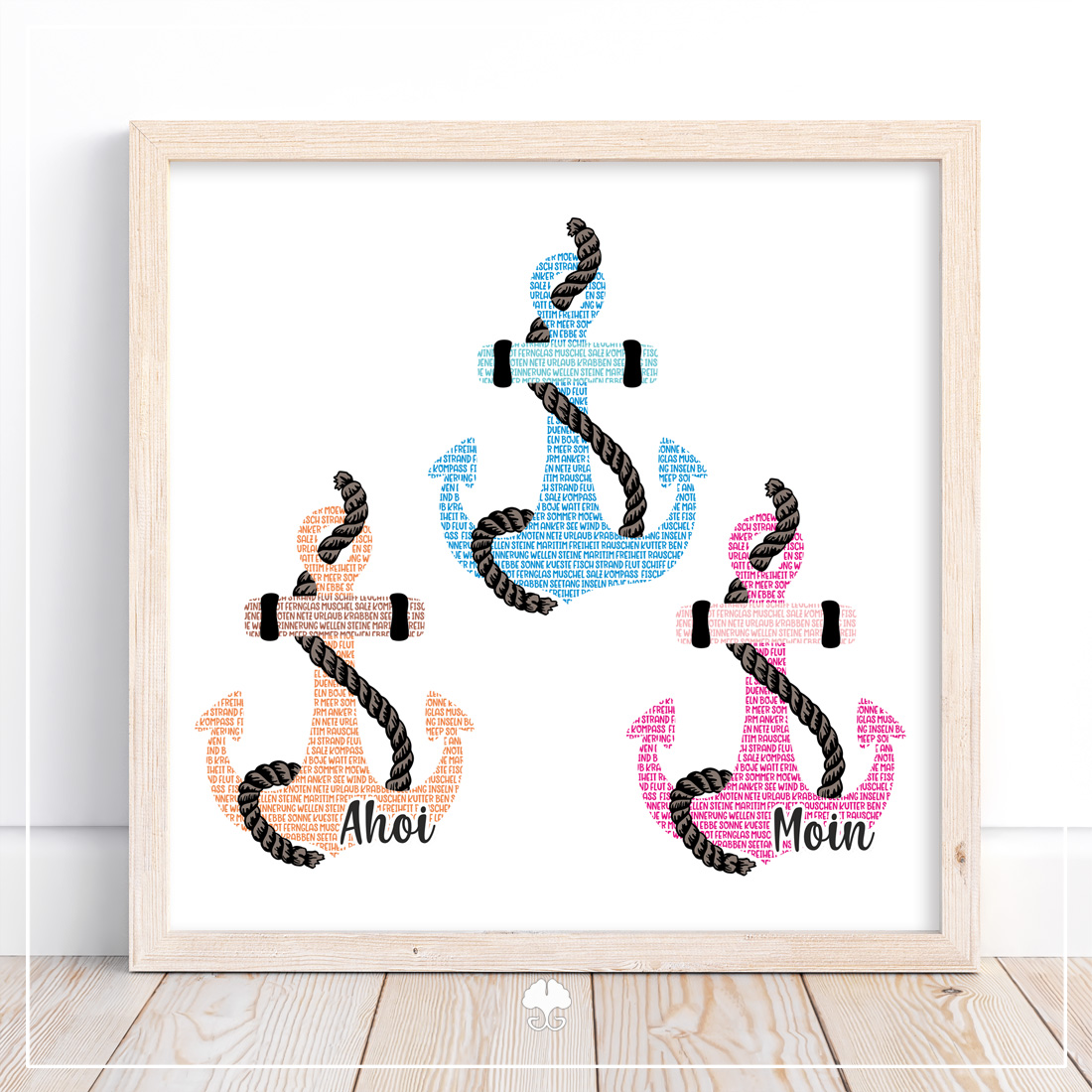Je Design gibt es drei Varianten. Den Anker ohne große Schrift und dann einmal mit ‚Moin‘ und einmal mit ‚Ahoi‘. Beim Leuchtturm unterscheiden sich die Gebäudeelemente (mal mehr, mal weniger Schrift)