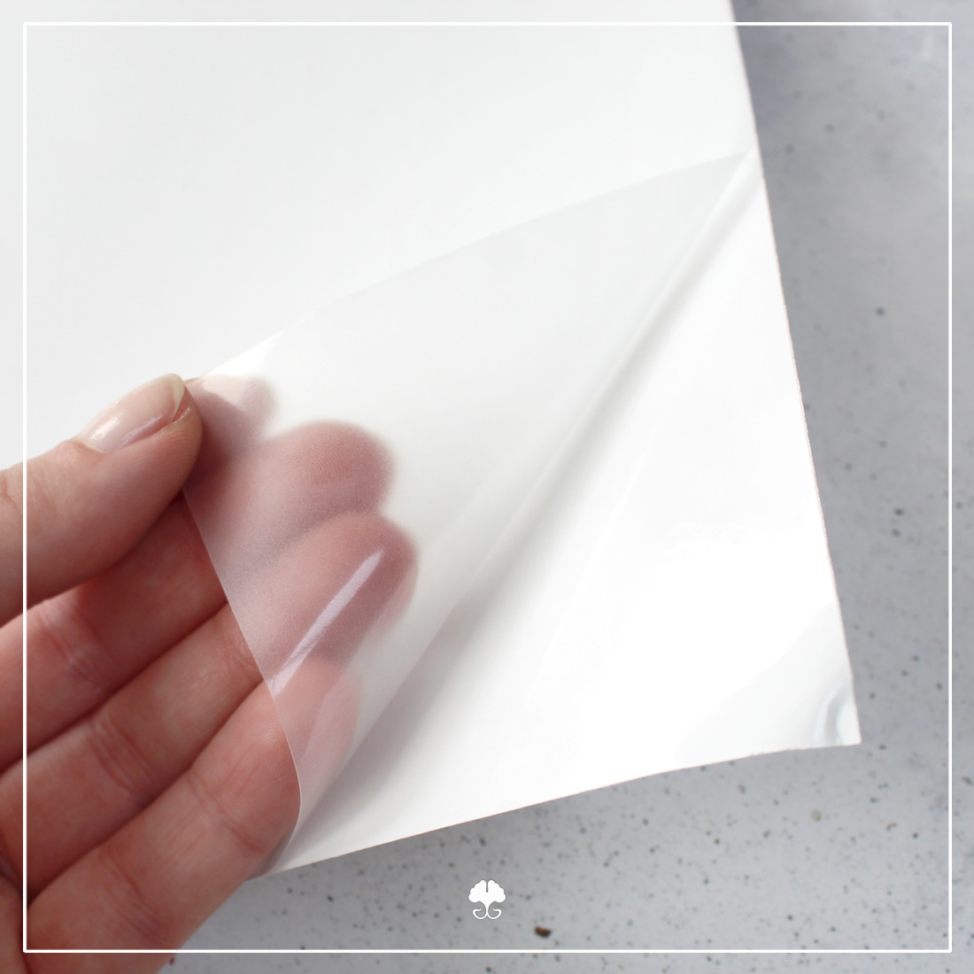 Vinylfolie kommt generell mit einem Papierträger. Das heißt, du hast eine stumpfe, weiße Rückseite bei deiner Folie. Das Trägerpapier hat auch in den meisten Fällen ein Kästchenmuster auf der Rückseite. Löst du eine Ecke etwas, ist es zwar auf der anderen Seite beschichtet, aber klebt selbst nicht. Dafür tut dies deine Folie.